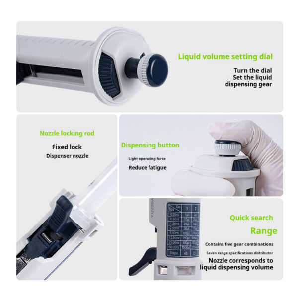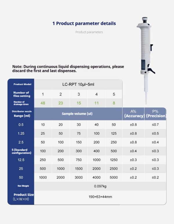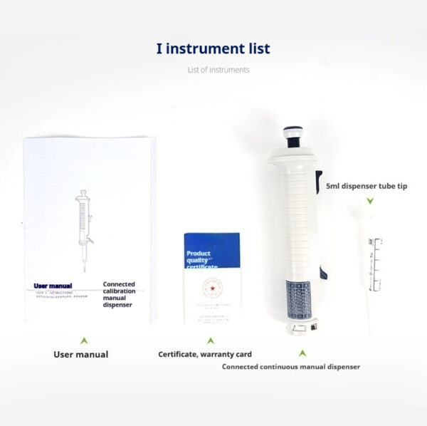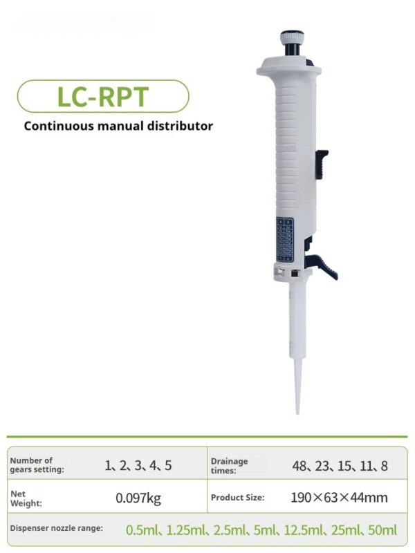 Continuous manual distributor, laboratory distributor, liquid dispenser, pipette, 10 μ L-5mL